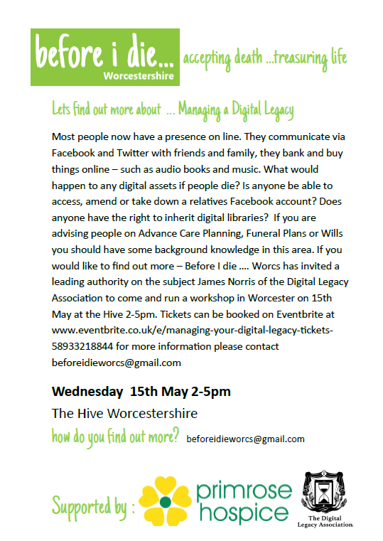 « All Events This event has passed. Digital Legacy Workshop May 15, 2019 @ 2:00 pm - 5:00 pm Free « The Mayor Of Worcester’s Annual Lecture End of Summer Party – Sponsored by St Ives Chambers » + Google Calendar+ iCal Export Details Date: May 15, 2019 Time: 2:00 pm - 5:00 pm Cost: Free Website: https://www.eventbrite.co.uk/e/managing-your-digital-legacy-tickets-58933218844?aff=eac2 Venue The Hive Sawmill Walk, The Butts Worcester, WR1 3PD + Google Map Website: http://www.thehiveworcester.org/